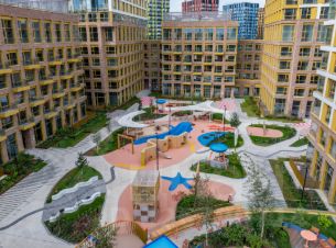 — Внутренний двор: садовые качели, светящиеся скамьи и подвесные кресла, детские площадки с батутами и песочницами, оранжерея и цветочный сад, воркаут-зона, теннисный стол и барная зона.