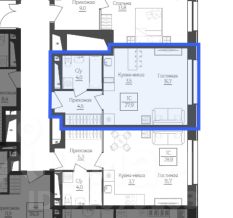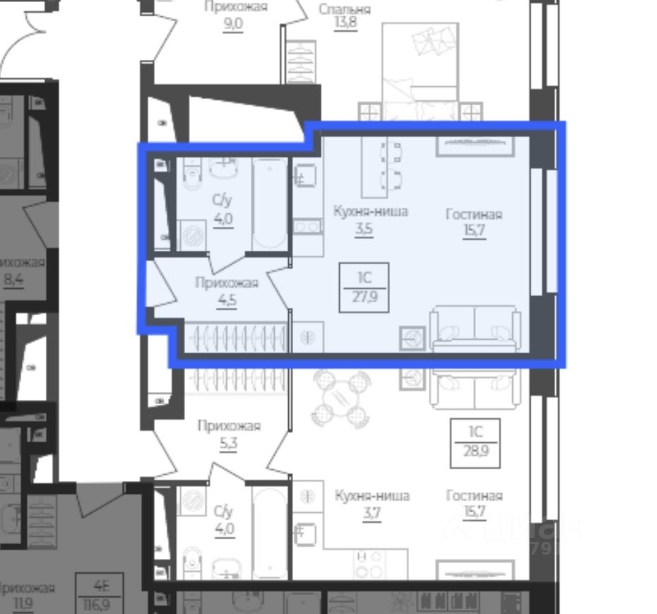 Просторная зона кухни-гостиной площадью 19,2 кв.м., функциональный санузел 4 квадрата.