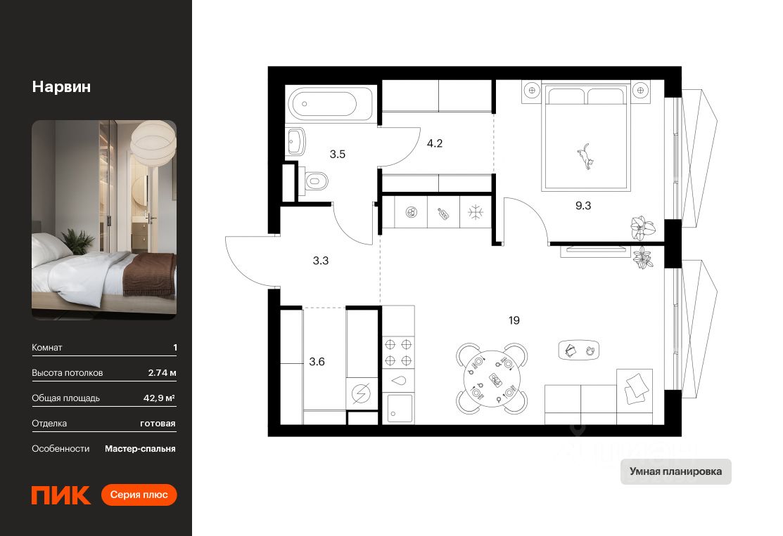 Новостройка! Продается 1-комн. кв-ра площадью 42,9 кв.м, (Корпус 1.3, Секция 3) 26 этаж 38-этажного дома в Нарвин от ПИК. Новый проект ПИК Серии плюс "Нарвин" возводится в Головинском районе Москвы.