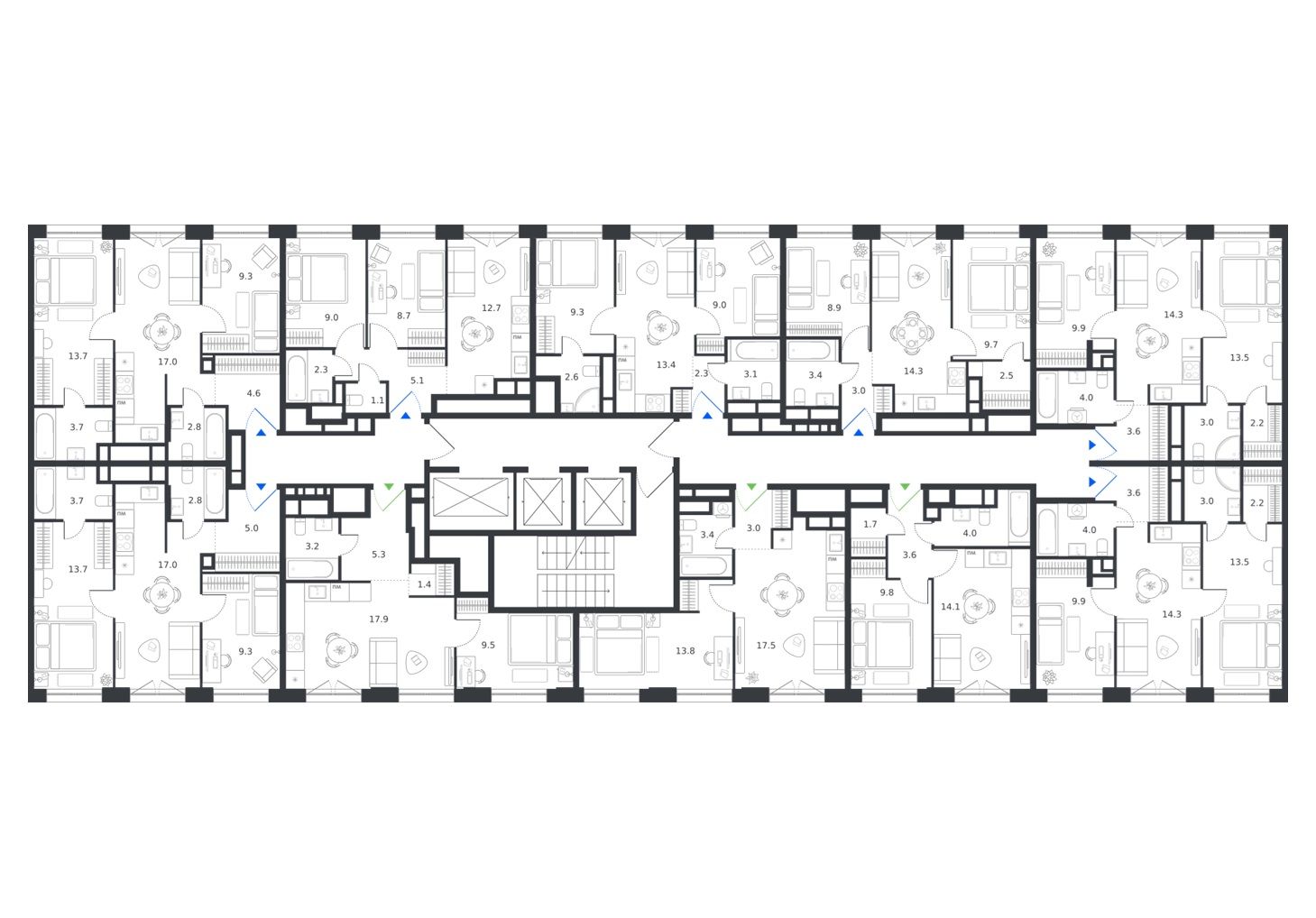 между квартирами светлые холлы. керамогранитный пол, энергоэффективная подсветка и цветовые акценты. никакой монотонности.