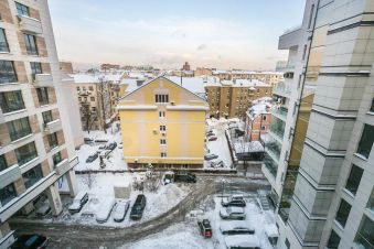 В квартире потолки 3,15 метра, панорамное остекление, все окна выходят в тихий двор, есть балкон 5,2 м2.