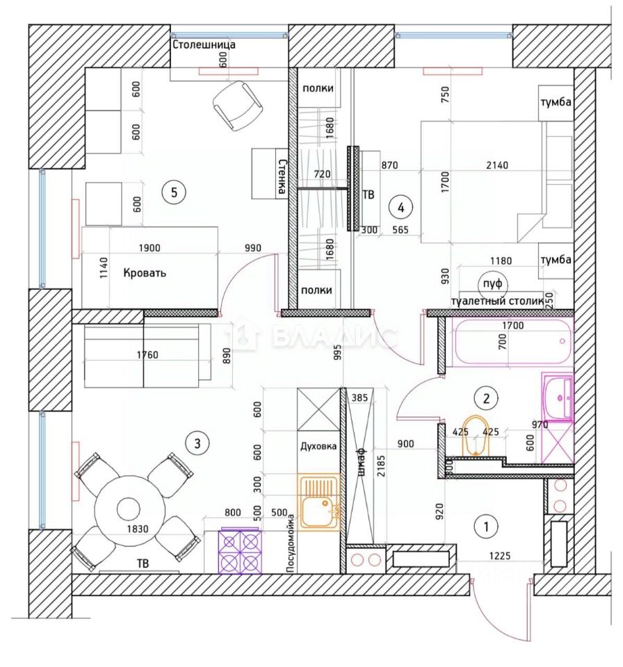 Планировка включает в себя две спальни, совмещенный просторный санузел и кухня-гостиная.