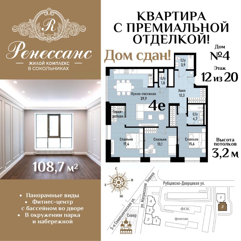 Жилой комплекс премиум-класса "Ренессанс" расположен на Рубцовско-Дворцовой улице исторического района Сокольники, в неск. мин. ходьбы от знаменитого парка "Сокольники", где круглый год можно прекрасно проводить время всей семьей. Квартиры продаются с полной отделкой, что обеспечивает комфорт проживания в доме сразу после получения ключей, т.к. исключает длительный период ремонта квартир - у вас и соседей, а также сохраняет презентабельные входные группы в идеальном состоянии. Премиальная отделка квартир "под ключ" выполнена европейскими специалистами по эксклюзивным дизайн-проектам с использованием дорогих материалов: экологичное напольное покрытие - инженерная доска TRIO на хвое (материал - дуб) и керамогранит KERAMA MARAZZI с обогревом пола, стяжка пола с шумоизоляцией, современные системы кондиционирования и сантехническое оборудование премиум-класса - Villeroy Boch, Grohe, Geberit Duofix, выключатели и розетки - Berker. Высокие потолки - 3,2 м и входные двери квартир - 2,4 м со вставками из массива дуба, выполненные в едином стиле, подчеркивают премиальный статус владельцев. Из панорамных окон премиального бренда Schuco открываются завораживающие виды на сияющие в лучах солнца купола церквей и храмов, зелень легендарного парка "Сокольники" и национального парка "Лосиный остров", излучины реки Яузы с величественной гранитной набережной, старинные здания, среди которых дворец императрицы Елизаветы Петровны, небоскребы "Москва-Сити", Останкинскую телебашню и приватную, охраняемую территорию комплекса с концепцией "двор без машин", изысканным ландшафтным дизайном, богатой коллекцией растений, пространствами для отдыха с роскошным фонтаном с красивой подсветкой, элегантной перголой, большими шахматами, детскими городками и спортивными площадками. Роскошный интерьер лобби: натуральный испанский мрамор, вертикальный фонтан, репродукции картин эпохи Возрождения, великолепная итальянская люстра ручной работы с подвесками из хрусталя CutCrystal и муранского стекла, иранские ковры, дизайнерская мебель. Лифты премиум-класса ThyssenKrupp. Консьерж-сервис. На этажах мусорокамеры закрытого типа. Из квартиры можно связаться с консьержем по видеодомофону британской компании BAS-IP. Уникальная транспортная доступность: 5 мин. на авто до ТТК и Русаковской эстакады, 10 мин. - до Садового кольца и ул. Земляной Вал, 15 мин. - до Кремлевской наб. В шаговой доступности - ст. м. и БКЛ "Сокольники" и "Электрозаводская". Развитая собственная инфраструктура: подземный паркинг, здание фитнес-центра с бассейнами, объекты торговли и сферы услуг. Отличная инфраструктура респектабельного района Сокольники: детсады, элитные общеобразовательные, музыкальные и спортивные школы, ТЦ и т.д.