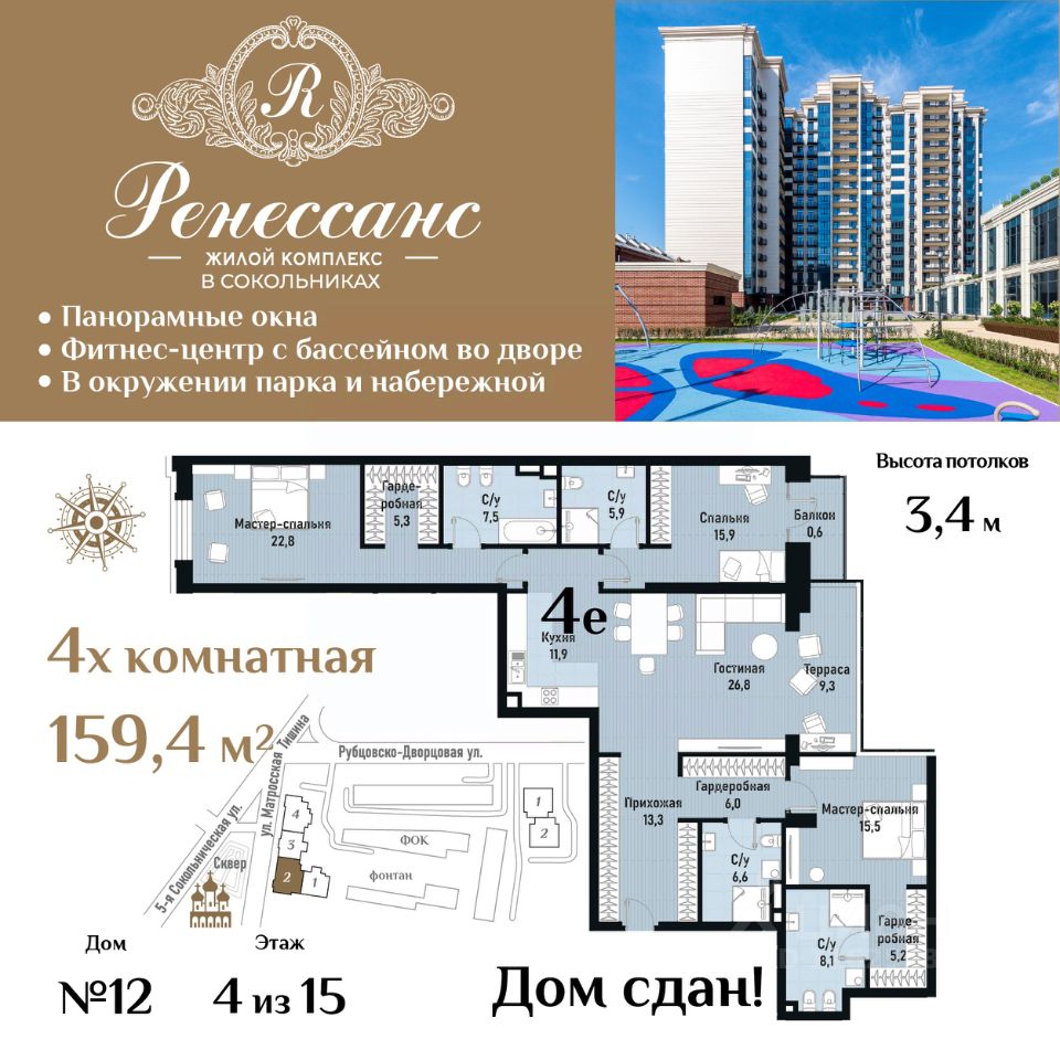 Жилой комплекс премиум-класса "Ренессанс" расположен на Рубцовско-Дворцовой улице старинного района Сокольники, в нескольких минутах ходьбы от знаменитого парка "Сокольники" - самого большого парка Москвы и одного из крупнейших в Европе, где круглый год можно прекрасно проводить время всей семьей. Из панорамных окон премиального бренда Schuco открываются завораживающие виды на сияющие в лучах солнца купола церквей и храмов, изумрудную зелень легендарного парка "Сокольники" и национального парка "Лосиный остров", излучины реки Яузы с величественной гранитной набережной, старинные здания, среди которых дворец императрицы Елизаветы Петровны, небоскребы "Москва-Сити", Останкинскую телебашню и приватную, охраняемую территорию комплекса с концепцией "двор без машин", изысканным ландшафтным дизайном, богатой коллекцией растений, пространствами для отдыха с роскошным фонтаном с красивой подсветкой, элегантной перголой, большими шахматами, детскими городками и спортивными площадками. Роскошный интерьер лобби: натуральный испанский мрамор, вертикальный фонтан, репродукции картин эпохи Возрождения, великолепная итальянская люстра ручной работы с подвесками из хрусталя CutCrystal и муранского стекла, иранские ковры и дизайнерская мебель. Лифты премиум-класса ThyssenKrupp. Консьерж-сервис. На этажах мусорокамеры закрытого типа. Из квартиры можно связаться с консьержем по видеодомофону британской компании BAS-IP. Уникальная транспортная доступность: 5 мин. на авто - до ТТК и Русаковской эстакады; 10 мин. - до Садового кольца и улицы Земляной Вал; 15 мин. - до Кремлевской набережной. В шаговой доступности - ст. м. и БКЛ "Сокольники" и "Электрозаводская". Развитая собственная инфраструктура: подземный паркинг, здание фитнес-центра с бассейнами, объекты торговли и сферы услуг. Отличная инфраструктура респектабельного района Сокольники: детские сады, элитные общеобразовательные, музыкальные и спортивные школы, ТЦ, рестораны, банки.