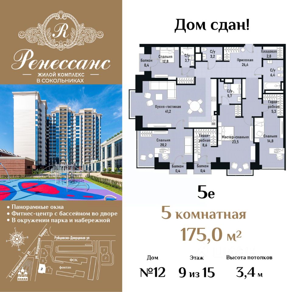 Жилой комплекс премиум-класса "Ренессанс" расположен на Рубцовско-Дворцовой улице старинного района Сокольники, в нескольких минутах ходьбы от знаменитого парка "Сокольники" - самого большого парка Москвы и одного из крупнейших в Европе, где круглый год можно прекрасно проводить время всей семьей. Из панорамных окон премиального бренда Schuco открываются завораживающие виды на сияющие в лучах солнца купола церквей и храмов, изумрудную зелень легендарного парка "Сокольники" и национального парка "Лосиный остров", излучины реки Яузы с величественной гранитной набережной, старинные здания, среди которых дворец императрицы Елизаветы Петровны, небоскребы "Москва-Сити", Останкинскую телебашню и приватную, охраняемую территорию комплекса с концепцией "двор без машин", изысканным ландшафтным дизайном, богатой коллекцией растений, пространствами для отдыха с роскошным фонтаном с красивой подсветкой, элегантной перголой, большими шахматами, детскими городками и спортивными площадками. Роскошный интерьер лобби: натуральный испанский мрамор, вертикальный фонтан, репродукции картин эпохи Возрождения, великолепная итальянская люстра ручной работы с подвесками из хрусталя CutCrystal и муранского стекла, иранские ковры и дизайнерская мебель. Лифты премиум-класса ThyssenKrupp. Консьерж-сервис. На этажах мусорокамеры закрытого типа. Из квартиры можно связаться с консьержем по видеодомофону британской компании BAS-IP. Уникальная транспортная доступность: 5 мин. на авто - до ТТК и Русаковской эстакады; 10 мин. - до Садового кольца и улицы Земляной Вал; 15 мин. - до Кремлевской набережной. В шаговой доступности - ст. м. и БКЛ "Сокольники" и "Электрозаводская". Развитая собственная инфраструктура: подземный паркинг, здание фитнес-центра с бассейнами, объекты торговли и сферы услуг. Отличная инфраструктура респектабельного района Сокольники: детские сады, элитные общеобразовательные, музыкальные и спортивные школы, ТЦ, рестораны, банки.