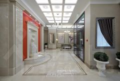 Роскошный интерьер лобби: натуральный испанский мрамор, вертикальный фонтан, репродукции картин эпохи Возрождения, великолепная итальянская люстра ручной работы с подвесками из хрусталя CutCrystal и муранского стекла, иранские ковры и дизайнерская мебель. Лифты премиум-класса ThyssenKrupp.
