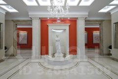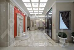 Роскошный интерьер лобби: натуральный испанский мрамор, вертикальный фонтан, репродукции картин эпохи Возрождения, великолепная итальянская люстра ручной работы с подвесками из хрусталя CutCrystal и муранского стекла, иранские ковры и дизайнерская мебель. Лифты премиум-класса ThyssenKrupp.