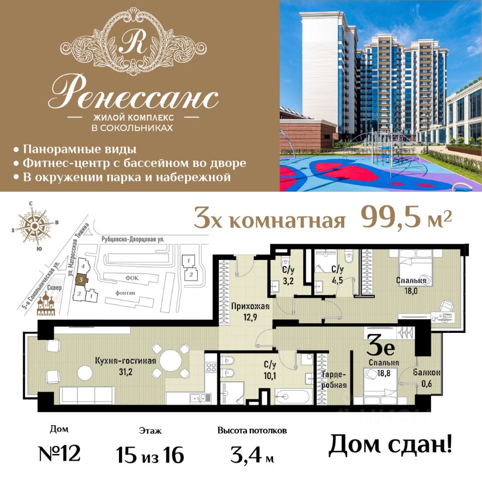 Жилой комплекс премиум-класса "Ренессанс" расположен на Рубцовско-Дворцовой улице старинного района Сокольники, в нескольких минутах ходьбы от знаменитого парка "Сокольники" - самого большого парка Москвы и одного из крупнейших в Европе, где круглый год можно прекрасно проводить время всей семьей. Из панорамных окон премиального бренда Schuco открываются завораживающие виды на сияющие в лучах солнца купола церквей и храмов, изумрудную зелень легендарного парка "Сокольники" и национального парка "Лосиный остров", излучины реки Яузы с величественной гранитной набережной, старинные здания, среди которых дворец императрицы Елизаветы Петровны, небоскребы "Москва-Сити", Останкинскую телебашню и приватную, охраняемую территорию комплекса с концепцией "двор без машин", изысканным ландшафтным дизайном, богатой коллекцией растений, пространствами для отдыха с роскошным фонтаном с красивой подсветкой, элегантной перголой, большими шахматами, детскими городками и спортивными площадками. Роскошный интерьер лобби: натуральный испанский мрамор, вертикальный фонтан, репродукции картин эпохи Возрождения, великолепная итальянская люстра ручной работы с подвесками из хрусталя CutCrystal и муранского стекла, иранские ковры и дизайнерская мебель. Лифты премиум-класса ThyssenKrupp. Консьерж-сервис. На этажах мусорокамеры закрытого типа. Из квартиры можно связаться с консьержем по видеодомофону британской компании BAS-IP. Уникальная транспортная доступность: 5 мин. на авто - до ТТК и Русаковской эстакады; 10 мин. - до Садового кольца и улицы Земляной Вал; 15 мин. - до Кремлевской набережной. В шаговой доступности - ст. м. и БКЛ "Сокольники" и "Электрозаводская". Развитая собственная инфраструктура: подземный паркинг, здание фитнес-центра с бассейнами, объекты торговли и сферы услуг. Отличная инфраструктура респектабельного района Сокольники: детские сады, элитные общеобразовательные, музыкальные и спортивные школы, ТЦ, рестораны, банки.