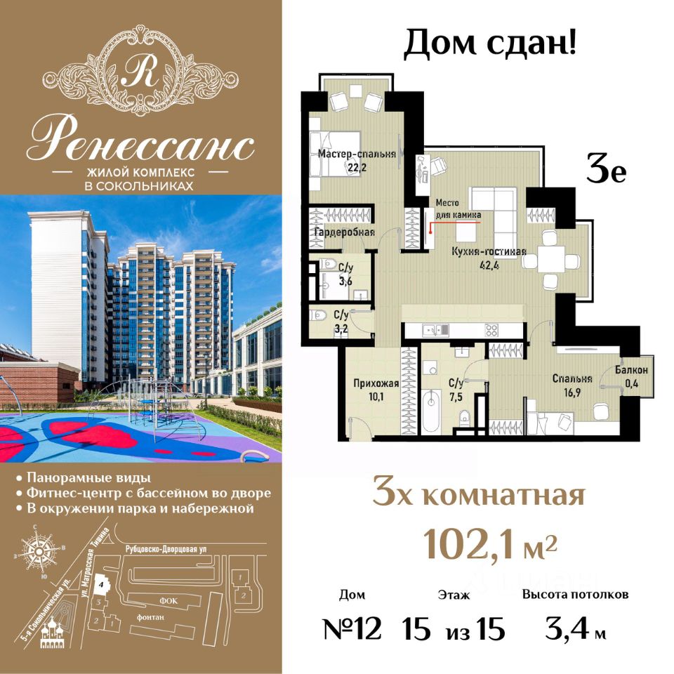 Жилой комплекс премиум-класса "Ренессанс" расположен на Рубцовско-Дворцовой улице старинного района Сокольники, в нескольких минутах ходьбы от знаменитого парка "Сокольники" - самого большого парка Москвы и одного из крупнейших в Европе, где круглый год можно прекрасно проводить время всей семьей. Из панорамных окон премиального бренда Schuco открываются завораживающие виды на сияющие в лучах солнца купола церквей и храмов, изумрудную зелень легендарного парка "Сокольники" и национального парка "Лосиный остров", излучины реки Яузы с величественной гранитной набережной, старинные здания, среди которых дворец императрицы Елизаветы Петровны, небоскребы "Москва-Сити", Останкинскую телебашню и приватную, охраняемую территорию комплекса с концепцией "двор без машин", изысканным ландшафтным дизайном, богатой коллекцией растений, пространствами для отдыха с роскошным фонтаном с красивой подсветкой, элегантной перголой, большими шахматами, детскими городками и спортивными площадками. Роскошный интерьер лобби: натуральный испанский мрамор, вертикальный фонтан, репродукции картин эпохи Возрождения, великолепная итальянская люстра ручной работы с подвесками из хрусталя CutCrystal и муранского стекла, иранские ковры и дизайнерская мебель. Лифты премиум-класса ThyssenKrupp. Консьерж-сервис. На этажах мусорокамеры закрытого типа. Из квартиры можно связаться с консьержем по видеодомофону британской компании BAS-IP. Уникальная транспортная доступность: 5 мин. на авто - до ТТК и Русаковской эстакады; 10 мин. - до Садового кольца и улицы Земляной Вал; 15 мин. - до Кремлевской набережной. В шаговой доступности - ст. м. и БКЛ "Сокольники" и "Электрозаводская". Развитая собственная инфраструктура: подземный паркинг, здание фитнес-центра с бассейнами, объекты торговли и сферы услуг. Отличная инфраструктура респектабельного района Сокольники: детские сады, элитные общеобразовательные, музыкальные и спортивные школы, ТЦ, рестораны, банки.