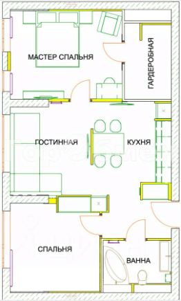 2 спальни, гостиная, кухня с обеденной зоной, гардеробная.