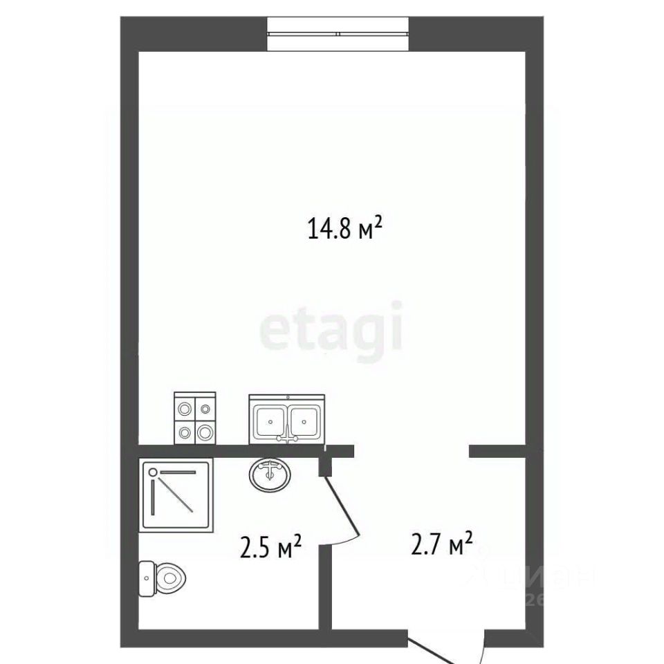 Планировка эффективно использует пространство, объединяя функциональную кухонную зону и жилой блок, а также включает совмещенный санузел.