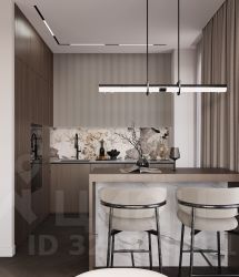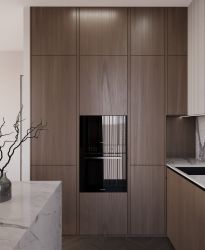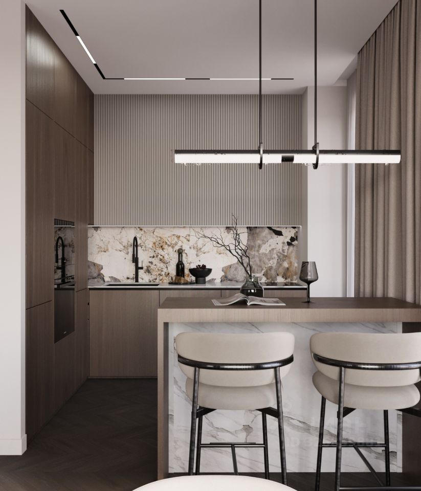 Встроенная кухня высокого уровня исполнения с островом и барной стойкой. Кухонный гарнитур изготовлен из шпона и эмали, столешницы кухни и острова — из кварца, что подчёркивает статус и практичность интерьера.