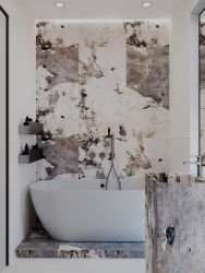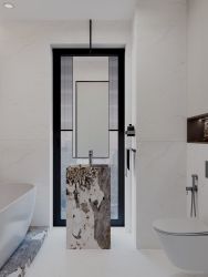 Приставная отдельностоящая ванна из искусственного камня и выразительная отдельностоящая раковина создают атмосферу настоящего комфорта.
