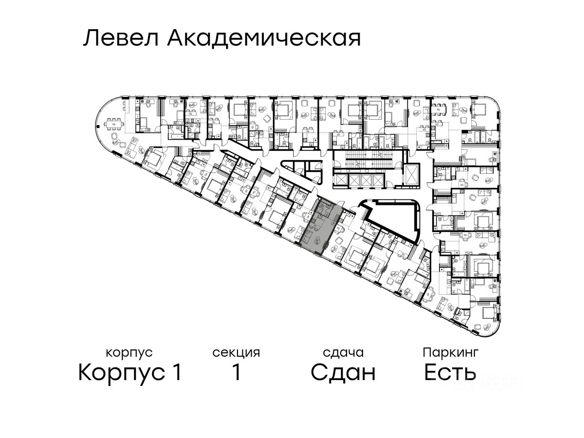 В Академическом районе продаётся квартира-студия площадью 24.90 кв.м без отделки. Квартира расположена на 13-м этаже 19-этажного жилого комплекса бизнес-класса Левел Академическая (компания Level Group).