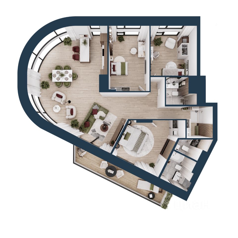 - квартиры с моллированным остеклением - радиусные окна открывают увеличенный угол обзора;
