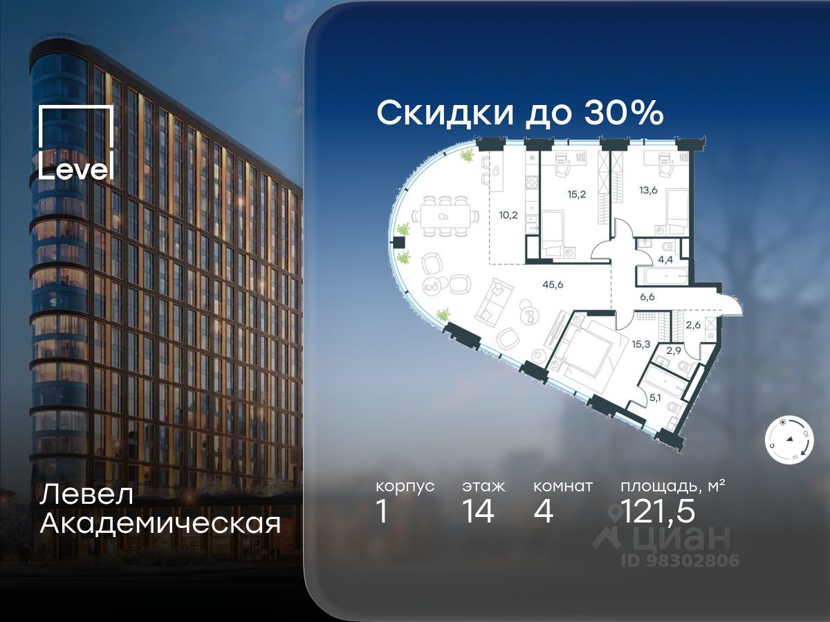 В Академическом районе продаётся 4-комнатная квартира площадью 121.50 кв.м без отделки. Квартира расположена на 14-м этаже 19-этажного жилого комплекса бизнес-класса Левел Академическая (компания Level Group).