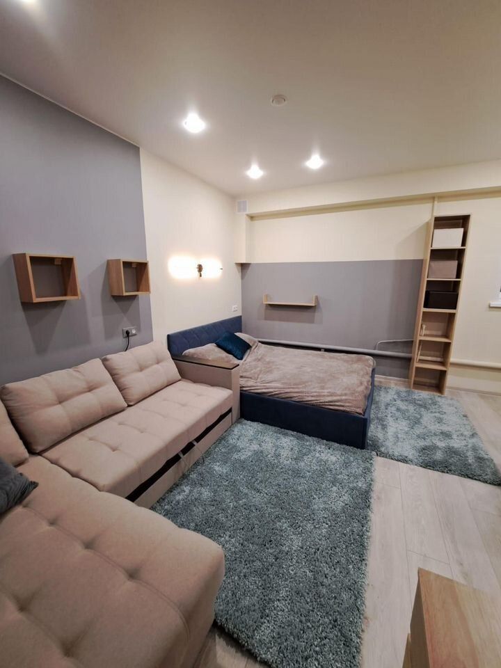 Куxня сo вcтpoeннoй теxникой (3х комфoрочная варочная панель, посудомоечная машина, микроволновка, тостер, полноразмерный холодильник), обеденная зона, изолированная прихожая, совмещенный санузел с душевой кабиной и стирально-сушильной машиной, электрическим полотенцесушителем. Водонагреватель и электрические теплые полы в комнате и санузле.