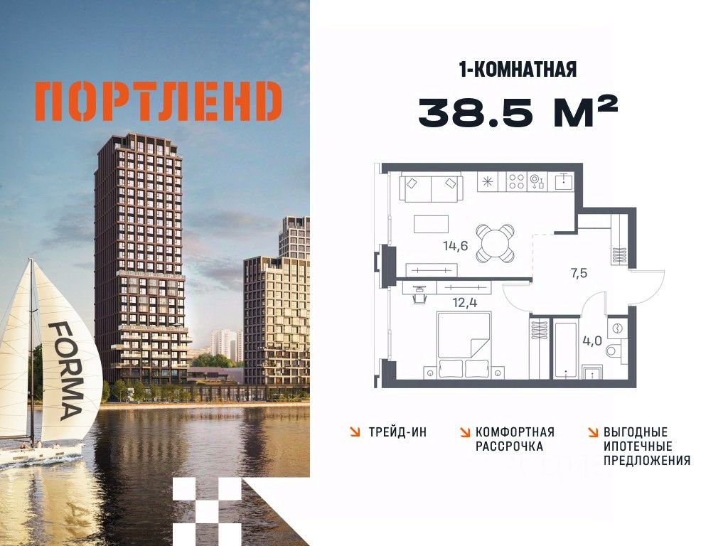 Цены указаны с условием 100% оплаты и стандартной ипотеки. Продаётся 1-к. квартира, 2 этаж в жилом комплексе бизнес-класса ПОРТЛЕНД от девелопера FORMA. ЖК расположен на берегу Москвы-реки в северной части района Печатники в акватории Южного речного порта. Основные преимущества проекта: • Самая протяженная береговая линия реки в Москве 13 км. • Вид на реку в сторону запада панорамные окна на самое широкое водное пространство Москва-реки (900 м) и на закат. • 95% квартир с видом на воду. • К ПОРТЛЕНД не примыкает крупных автомагистралей - отсутствие фонового шума дорог. • В перспективе ближайших 11 лет на территории района запланировано грандиозное преобразование и комплексное развитие. • Собственная набережная длиной 412 м., которая после завершения строительства сомкнется с эко-парком Печатники. • Прямой выход к воде и отсутствие проезжей части между ПОРТЛЕНД и береговой линией. • Инфраструктурное разнообразие: супермаркеты, крупные торговые центры, рестораны, кафе, фитнес-клубы, бьюти-салоны, компании сферы услуг и многое другое. • Собственная школа на 300 мест и детский сад на 275 мест. • Паркинг на 650 м/м • Транспортная вседоступность: метро, авто, велосипед, речной трамвай, канатная дорога • 15 мин. пешком до м. Печатники, 15 мин. на авто до ТТК, 20 минут на авто до Садового кольца