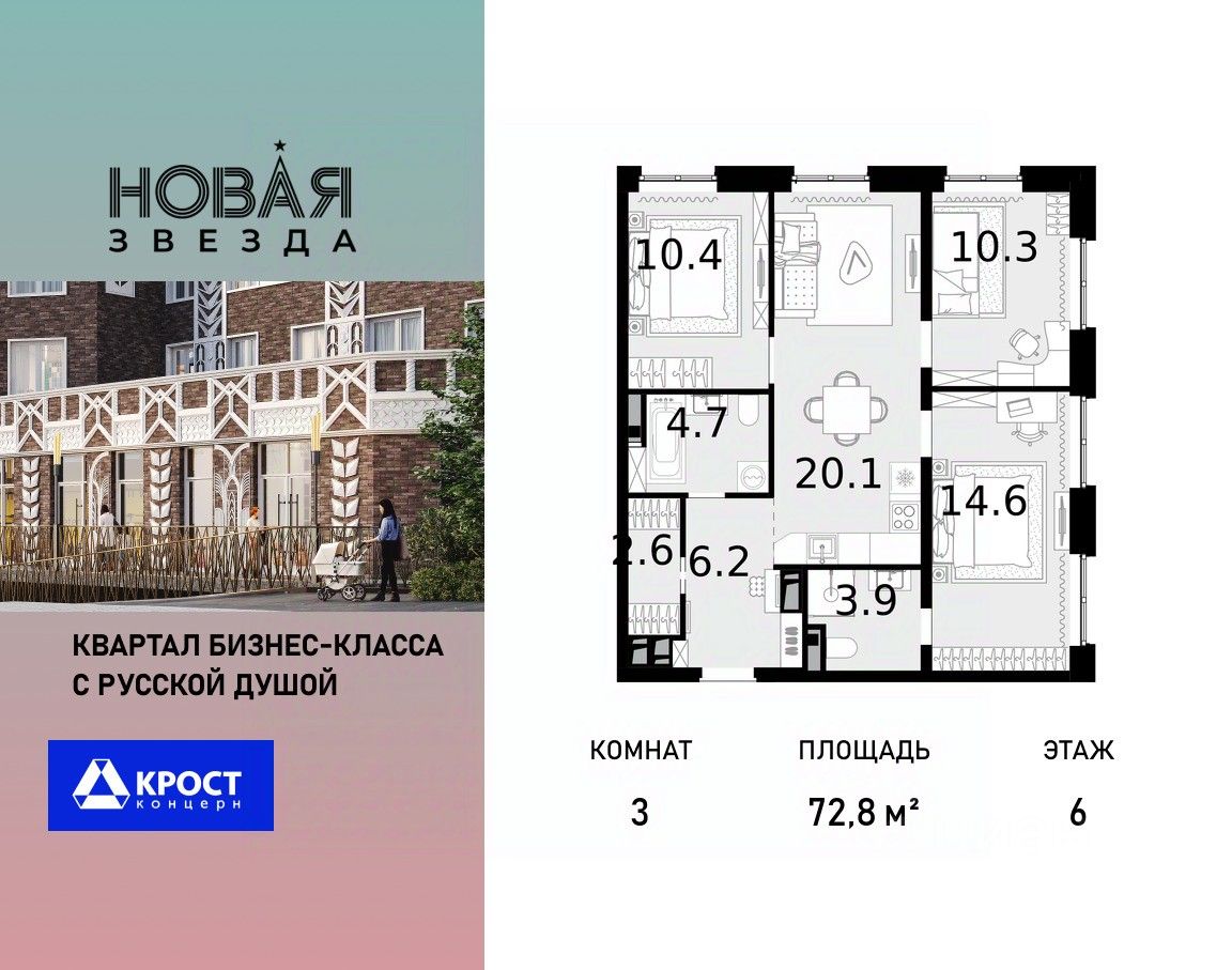 Продаётся 3-к квартира 72.8 кв.м. на 6-м этаже 22 этажного дома, корпус 6 - Резиденция "Хабаровск". Без отделки.