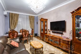 В гостиной удобный раскладной диван из натуральной кожи. Мебель в классическом стиле из массива дерева.