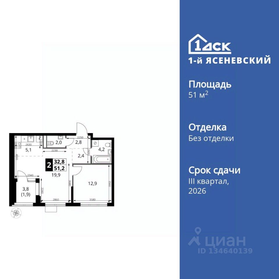 Продаётся 2-к квартира номер 577 общей площадью 51.2 кв.м. на 17-м этаже 18 этажного здания. Без отделки. Цена с учётом скидки.