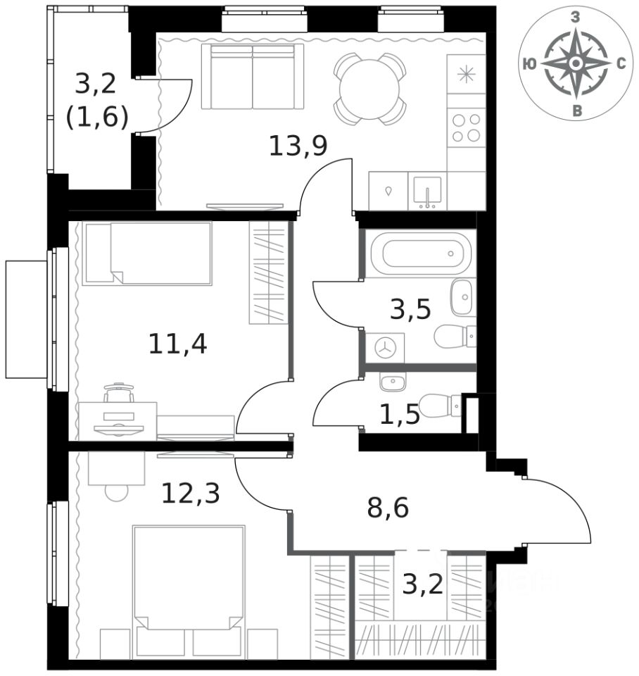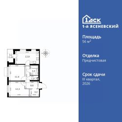 Продаётся 2-к квартира номер 113 общей площадью 56 кв.м. на 13-м этаже 16 этажного здания. Отделка Whitebox. Цена с учётом скидки.