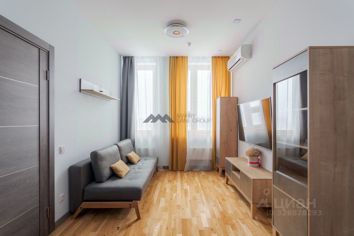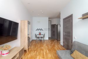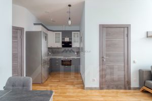 Апартамент расположен на 20 этаже. Общая площадь - 41.2 кв.м. Кухня-гостиная, спальня с гардеробной, совмещенный с/у с ванной, шкаф-купе в прихожей.