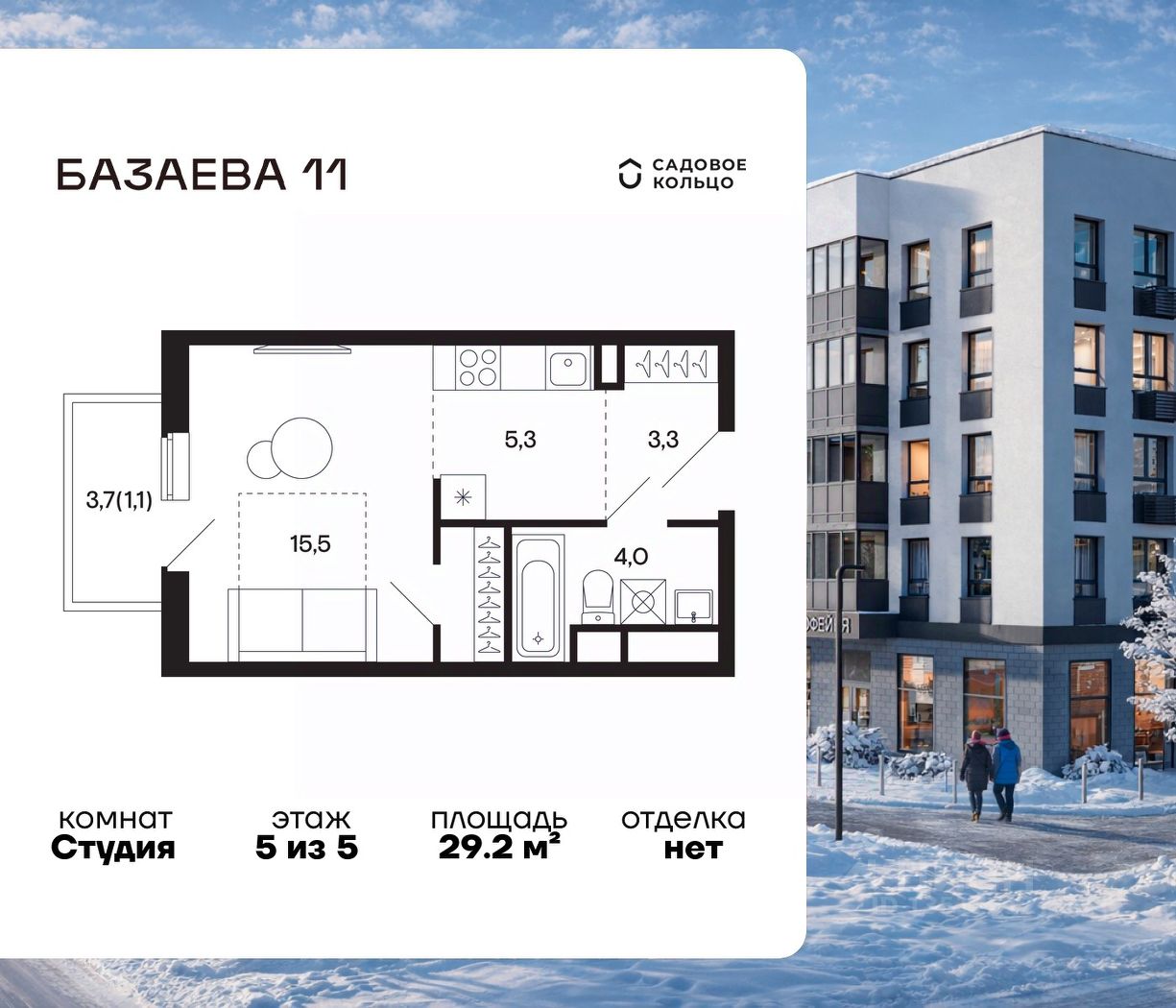 Продается квартира в ЖК "Базаева, 11" студия на 5 этаже 5 этажного дома. Общая площадь: 29.2 кв.м. Высота потолков 2.72 м. Срок сдачи 2 квартал 2027 г. Эскроу-счет. Застройщик ГК "Садовое кольцо".
