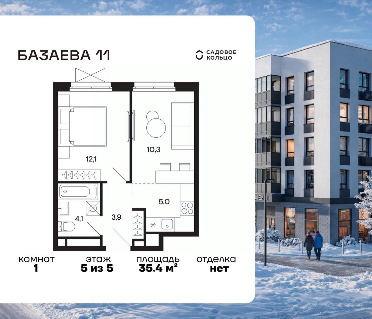 Продается квартира в ЖК "Базаева, 11" с 1 спальней на 5 этаже 5 этажного дома. Общая площадь: 35.4 кв.м. Высота потолков 2.72 м. Срок сдачи 2 квартал 2027 г. Эскроу-счет. Застройщик ГК "Садовое кольцо".