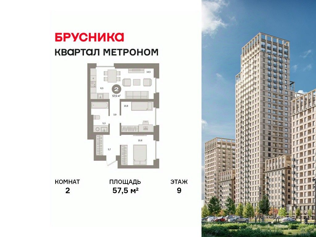Квартира с кухней-гостиной и двумя спальнями в квартале "Метроном". Особенности планировки: вид во двор, предчистовая отделка.