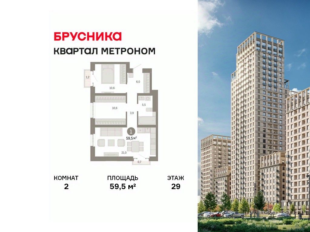 Квартира с кухней-гостиной и двумя спальнями в квартале "Метроном". Особенности планировки: балкон, окна в пол, предчистовая отделка, французский балкон.