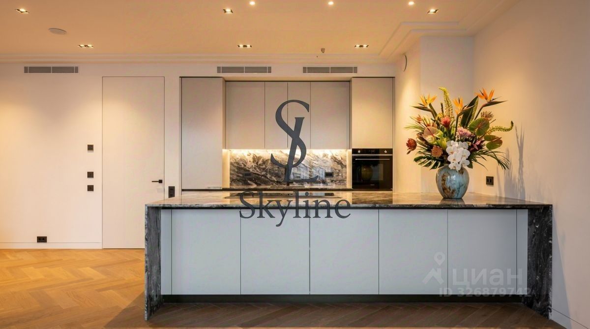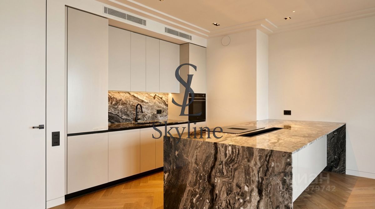В квартире установлены кухни от итальянского бренда Cesar со встроенной бытовой техникой премиальной линейки Smeg. Кухонный остров, столешница и фартук кухни выполнены из эксклюзивного итальянского мрамора Arabescato Grigio Orobico, одним из лучших видов мрамора на итальянском рынке натуральных отделочных камней.