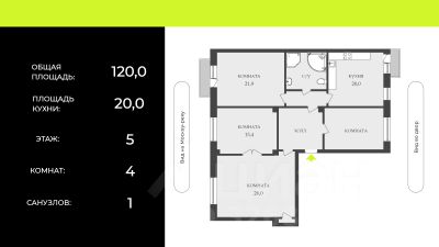 Общая площадь — 120м². Четыре комнаты правильной формы. Кухня 20м² полностью оборудована всей необходимой техникой. В ванной комнате установлены большая ванна и душевая кабина. Два больших балкона. Высота потолков — 3,2 м. Для улучшения шумоизоляции в окнах установлены двойные стеклопакеты, оконные рамы из натурального дуба. Отсутствие в квартире несущих стен даёт, при необходимости перепланировки, максимум свободы для любых дизайнерских решений — от классической семейной планировки до стильного современного пространства. Площадь квартиры указана с учетом площади двух балконов, площадь в выписке - 115.8м².