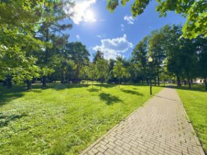 Двор закрытый, оборудован шлагбаумом. Во дворе дома — ухоженный сквер с цветниками, газонами и обустроенными детскими площадками.