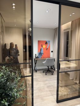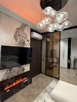 Дорогая отделка, премиальные материалы (Пол -крупноформатный керамогранит с теплыми полом и инженерная доска, потолок - гипсокартон, высокие двери шпон в потолок, вся мебель по индивид проекту, бытовая техника Bosch, камин).