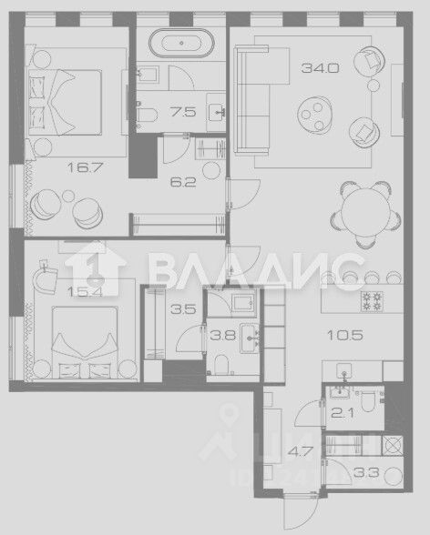 Общая площадь квартиры составляет 112 кв. м, включая просторную кухню-гостиную площадью 34 кв. м. Изолированные комнаты (32,1 кв. м) обеспечивают уединение и удобство для всех членов семьи. Наличие гардеробных зон позволяет рационально организовать и эффективно использовать каждый квадратный метр помещения.