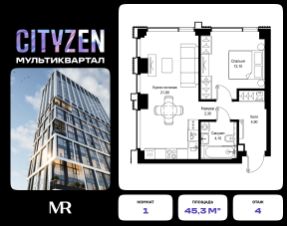 Продается 1-комнатная квартира от застройщика в жилом мультиквартале CITYZEN на 4-м этаже в корпусе #2 урбан-блока PARUS. Общая площадь лота составляет 45.30 м²