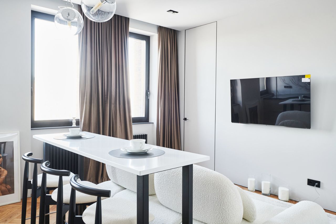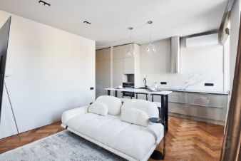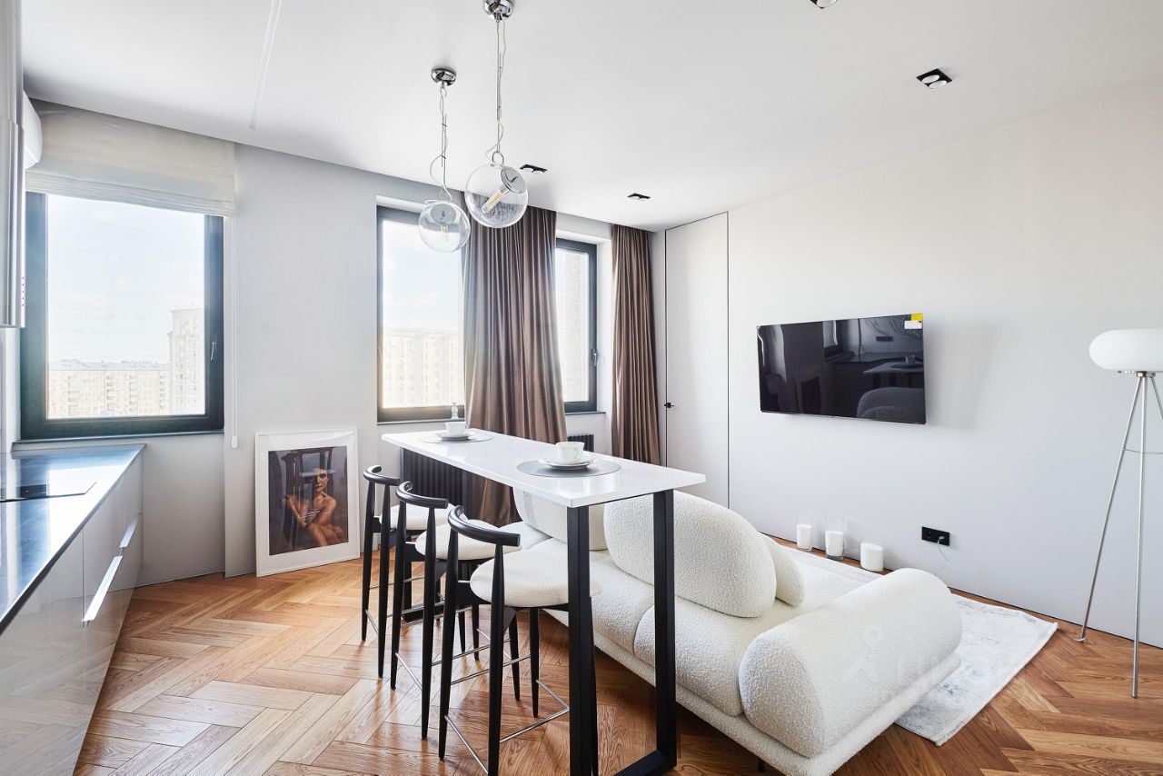 Апартамент в ЖК бизнес класса Baires. Просторная и максимально продуманная планировка с большим количеством мест хранения. Планировка: холл с большим шкафом до потолка, кухня-гостиная, спальня с гардеробной, санузел с постирочной. В квартире выполнен дизайнерский ремонт и укомплектована всей мебелью и техникой. Вся техника верхняя линейка Haier - холодильник 190см, духовой шкаф с функцией приготовления на пару, посудомоечная машина, микроволновая печь, варочная панель, мощная вытяжка, мощный кондиционер с датчиком движения и корректировки воздушных потоков, стирально-сушильная машина, измельчитель пищевых отходов, телевизор; разные сценарии освещения от Maytoni и других известных производителей, стеклянные панели выключателей, высокие двери в потолок, на полу дубовый паркет, оборудованная гардеробная комната, кровать Estetica, матрас King Koil. Сделана шумоизоляция, установлена очистка воды до питьевой, произведена полная замена отопления, установлены радиаторы с 10летней гарантией.