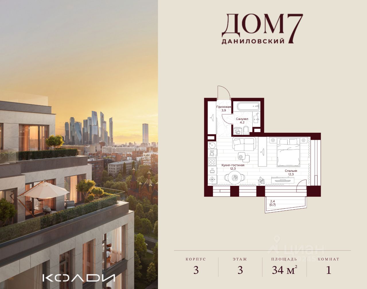 Продается 1-к квартира общей площадью 33.40 кв.м на 3 этаже в жилом квартале премиум-класса "Дом 7 Даниловский".