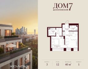 Продается 1-к квартира общей площадью 39.80 кв.м на 12 этаже в жилом квартале премиум-класса "Дом 7 Даниловский".