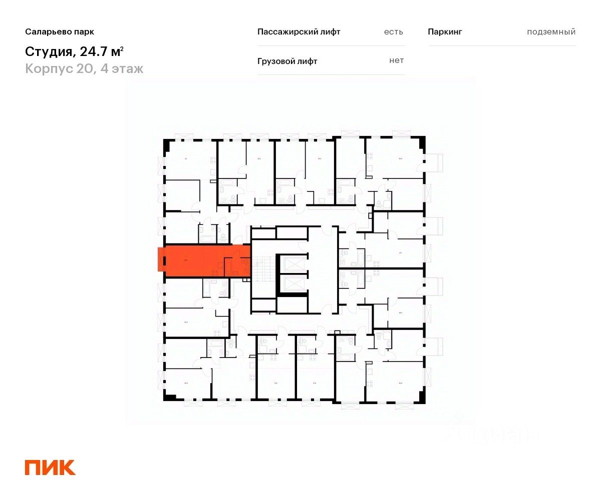 Продаётся квартира-студия площадью 24,7 кв.м на 4 этаже 16 этажного дома (Корпус 20, Секция 2) проекта ПИК Саларьево парк. Светлый просторный подъезд на уровне земли, функциональная планировка, большие окна, c отделкой.