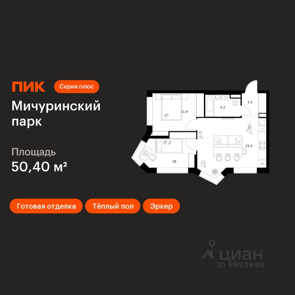 Продаётся 2-комн. квартира площадью 50,4 кв.м на 8 этаже 31 этажного дома (Корпус 4.3, Секция 2) проекта ПИК Мичуринский парк. Светлый просторный подъезд на уровне земли, функциональная планировка, большие окна, c отделкой.