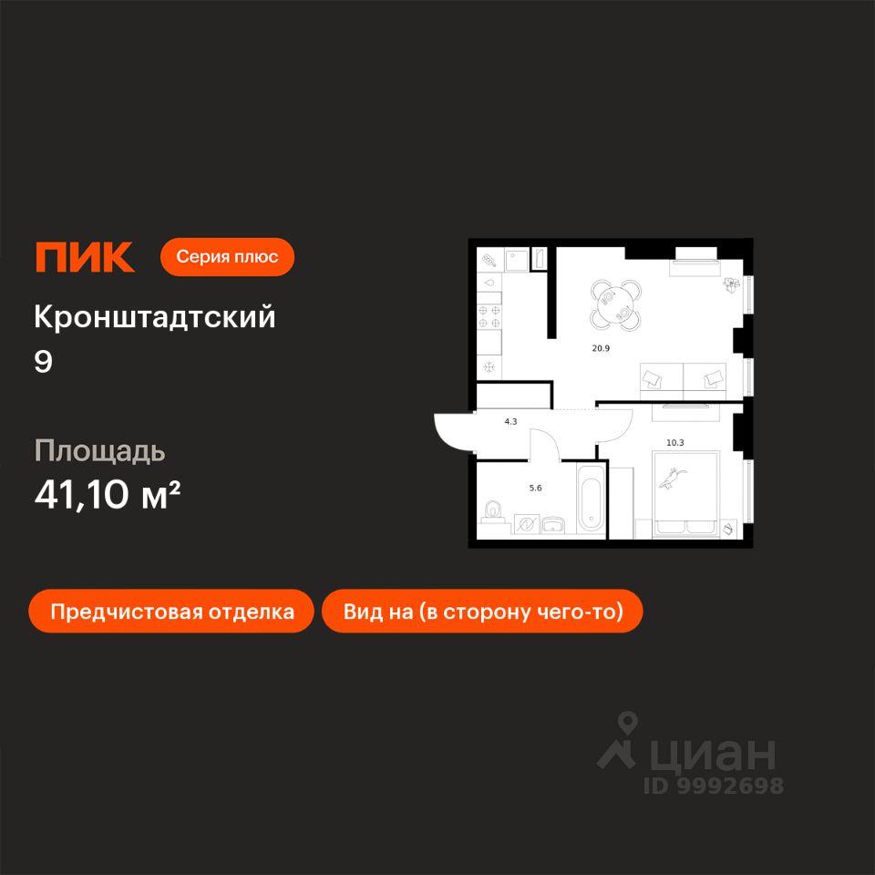 Продаётся 1-комн. квартира площадью 41,1 кв.м на 2 этаже 32 этажного дома (Корпус 1.1.3, Секция 3) проекта ПИК Кронштадтский 9. Светлый просторный подъезд на уровне земли, функциональная планировка, большие окна, предчистовая отделка.