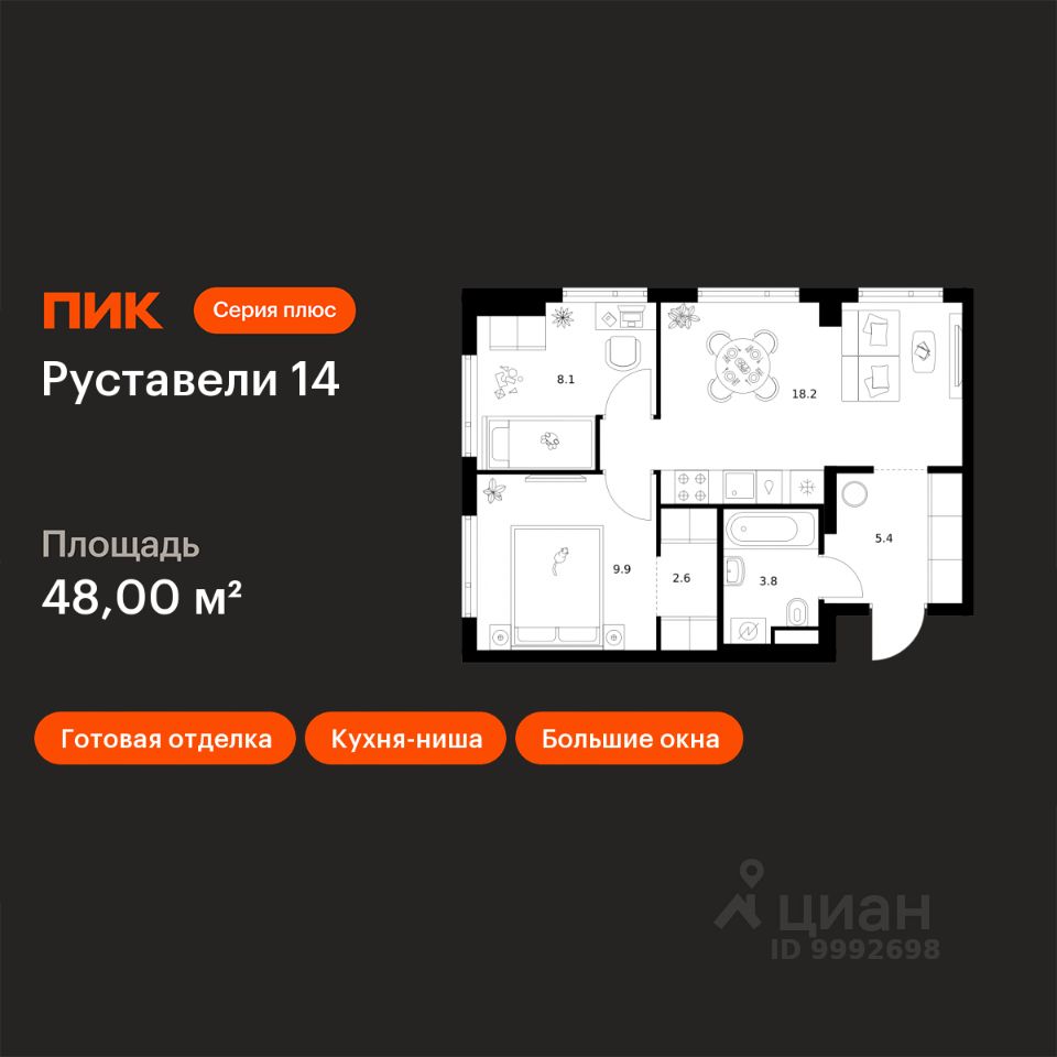 Продаётся 2-комн. квартира площадью 48 кв.м на 18 этаже 21 этажного дома (Корпус 3.5, Секция 1) проекта ПИК Руставели 14. Светлый просторный подъезд на уровне земли, функциональная планировка, большие окна, c отделкой.