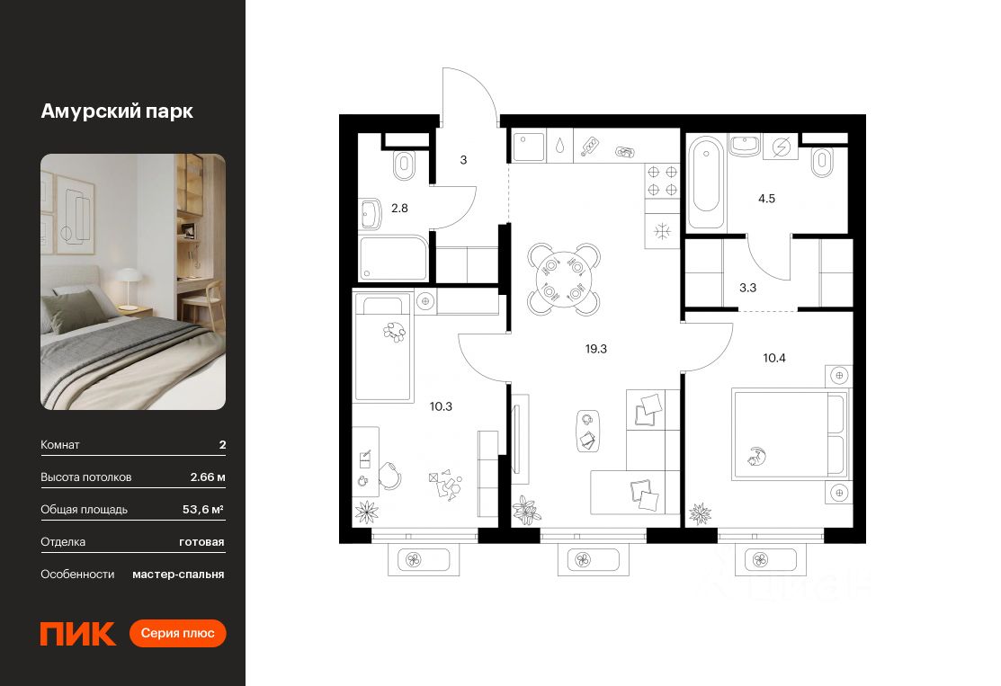 Продаётся 2-комн. квартира площадью 53,6 кв.м на 24 этаже 27 этажного дома (Корпус 4.3, Секция 3) проекта ПИК Амурский парк. Светлый просторный подъезд на уровне земли, функциональная планировка, большие окна, c отделкой.