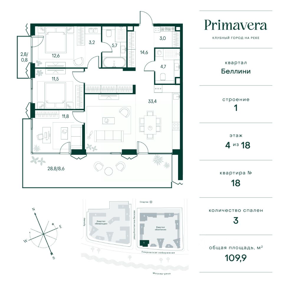 Клубный город на реке "Примавера" — это современный жилой комплекс премиум-класса, расположенный на первой береговой линии Москвы-реки в экологически чистом районе Покровское-Стрешнево. Под панорамными окнами квартир находится собственный экопарк с продуманной сетью прогулочных дорожек и современными детскими и спортивными площадками. За парком расположена набережная с собственным пляжем и зонами для отдыха. Клубный город на реке "Примавера" предлагает широкий выбор планировок для различных жизненных сценариев: от просторных однокомнатных квартир до пентхаусов и жилых помещений с террасами и патио. Выберите из 120 вариантов эргономичных планировок стандартного и евроформата. Из каждой квартиры открываются красивые виды на реку с углом обзора в 270 градусов. Дизайнерские лобби предлагают панорамный обзор на благоустроенный двор. Высокие потолки в 6 метров и качественная отделка создают атмосферу, схожую с пятизвездочными отелями. В "Примавера" есть всё необходимое для комфортной жизни в мегаполисе: • Образование для детей в шаговой доступности: 4 школы, 8 детских садов и развивающие центры с кружками и секциями. • Удобства на расстоянии приятной прогулки: супермаркеты, кафе, рестораны с верандами, салоны красоты, аптеки и многофункциональный центр для шоппинга и развлечений. • Умный дом: автоматизированное бесконтактное управление основными системами доступа и безопасности через мобильное приложение. Клубный город на реке "Примавера" выгодно сочетает комфорт городской жизни с близостью к природе. Живите в месте, где все создано для вашего удобства!