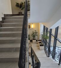 Фасад здания украшают оригинальные эркеры и панно из натурального камня, сочетающего в себе 5 оттенков травертина, символизирующих фасады старинных испанских улочек.