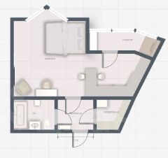 Квартира имеет редкую расширенную форму планировки - благодаря этому она больше, чем стандартные однушки в жк. Квартира расположена последнем этаже кирпичного здания, что удобно, над головой никто не топает и в окна никто не заглядывает.