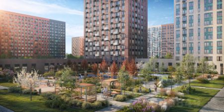 В квартале — монолитные дома комфортной высоты, от 10 этажей. Светлые фасады украшают кирпичные вставки в теплых природных оттенках.