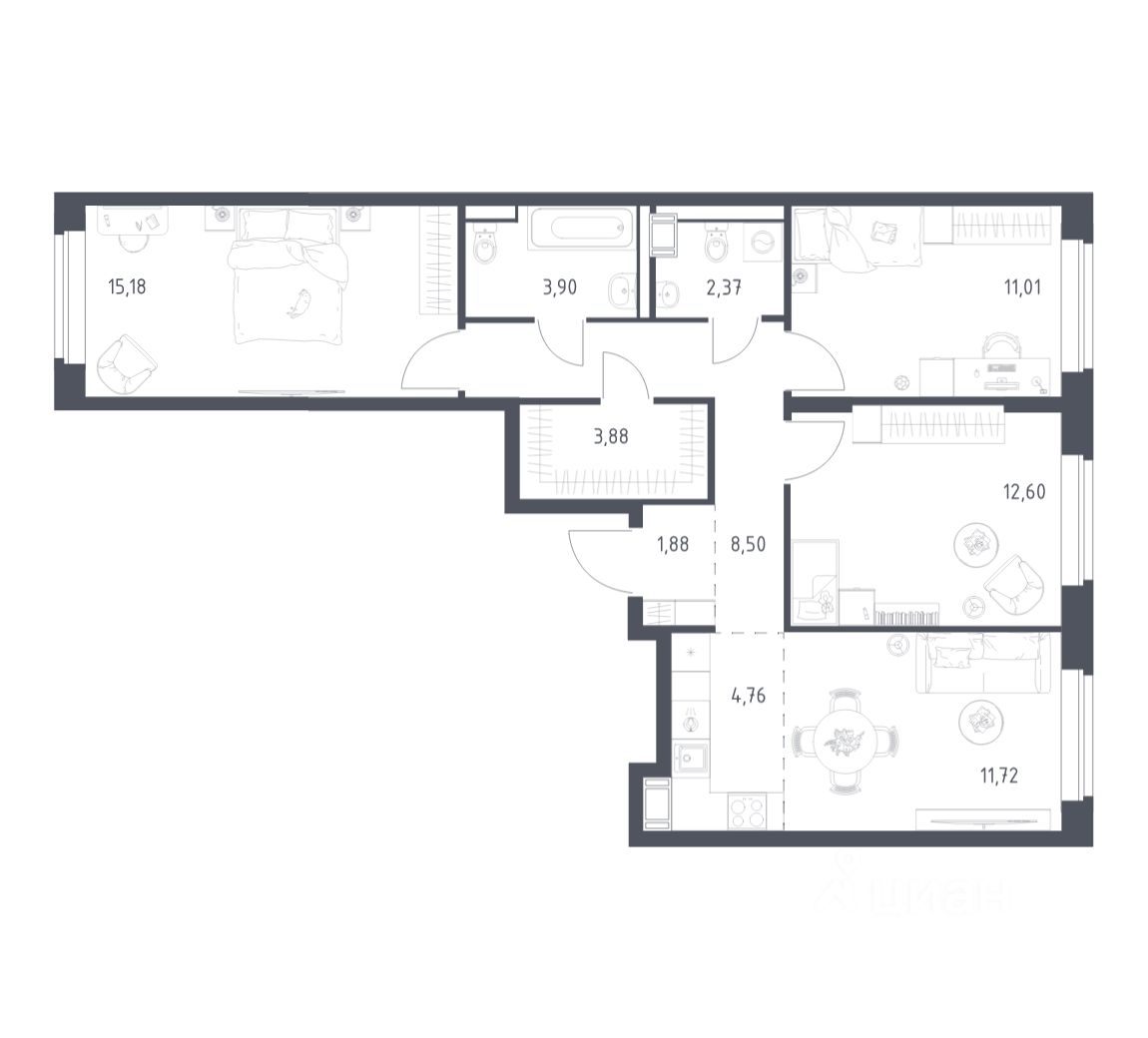 Строим кварталы для жизни с заботой о будущем. Предлагается 3-комнатная квартира комфорт-класса площадью 75,8 кв.м в корпусе 13 на 7-м этаже, в жилом комплексе "Алхимово".